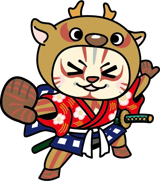 鹿の着ぐるみを着た猫のキャラクターで、胸のペンダントは町名物の「わらじカツ」。いつか役者として小鹿野歌舞伎の舞台に立つのが夢なのだとか。 -